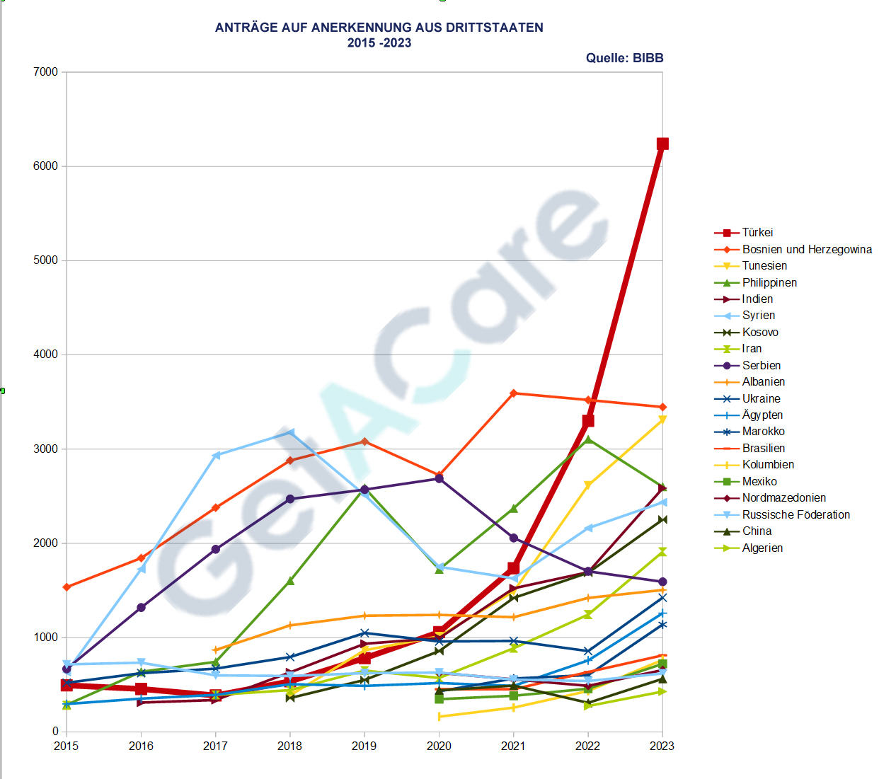 BIBB tarafından yayınlanan Almanya denklik istatistiklerinde 2023 yılında Türkiye’den yapılan denklik başvuruları rekor seviyeye ulaştı. 2015 yılında 500’den az olan başvuru sayısı, 8 yılda 12 kattan fazla artarak 2023’de 6240’a ulaştı. Bir önceki yıl bu sayı 3300 idi. Son dört yıl, üçüncü ülkeler olarak adlandırılan, EU, EWR, İsviçre dışındaki ülkelerden en çok başvuru gelen ülke Bosna Hersek idi. 2023 yılında Türkiye başvuruları Bosna Hersek’i açık ara farkla iki katına yakın başvuru ile geride bıraktı. Listede sonra gelen Tunus, Filipinler, Hindistan ve Suriye’nin toplam sayısının %43’ne ulaştı.